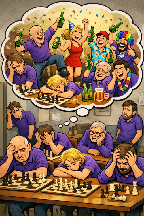 Ik tikte als vervangend teamleider in dertien zetten tijd twee koppen uitstekende koffie (net als op de IJsclub 1,00 euro) van de vriendelijke kantine van De Schelfhorst weg, maar concentreren ging niet van harte en geïnspireerd rekenen al helemaal niet. De opening was een kolfje naar de hand van Geert Kloppenburg, eerst schudde hij een bekend damevorkje op twee ongedekte pionnen uit z’n mouw en daarna een damevorkje op twee ongedekte stukken. c2-c3 gevolgd door Dd1-b3xd5-b3-d5xa8. Fantastisch natuurlijk. Vervolgens ging hij stukje bij beetje al dat plusmateriaal vrijwillig weer teruggeven en ik verklap maar alvast dat ik uiteindelijk won.