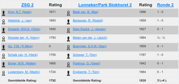Op een regenachtige herfstdag, zaterdag 1 november 2025, speelde het KNSB team SV Lonneker / SV Park Stokhorst 2 in Zwolle tegen ZSG-2. Het was de tweede ronde in Klasse 5B, de eerste hadden we verloren tegen De Zeven Pionnen-1. Ditkeer had het team een evenwichtige duo-club verdeling, hoewel iedereen zich nog steeds afvraagt waar Roelof nu eigenlijk schaakt.