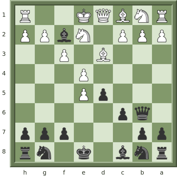 Mijn tegenstander ontwikkelde snel zijn Dame en Loper en dreigde daarmee een pion te winnen. Ik moest mijn Koning in het centrum houden en vaak langzame zetten spelen om mat en materiaalverlies te voorkomen. Met een Dame-ruil kon ik plotseling de angel uit de stelling halen en stond ik zo slecht nog niet. Als ik een pion opgaf zou mijn Koning opeens op een mooie plek voor het eindspel staan, en dan had ik best wat kansen gehad, maar ik hield krampachtig aan die pion vast, wat hopeloos afliep : al mijn stukken struikelden over elkaar, terwijl mijn tegenstander een paar open lijnen en diagonalen tot zijn beschikking had. Toen eenzelfde mat als in Paul Morphy’s ‘Opera partij’ amper te voorkomen was, gaf ik op.
