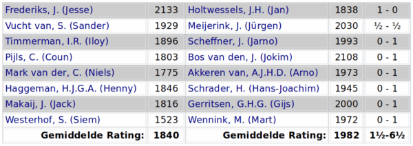 Bas speelde aan bord 1 met Wit een scherp opgezette partij, er waren aanvalskansen over en weer. Toen zijn tegenstander 2 lichte stukken offerde voor 2 pionnen en een Toren, dachten beide spelers dat dit zeer sterk was voor Zwart, maar na afloop gaf de computer het aan als gelijk, of een heel licht voordeel voor Wit. Maar goed, wij zijn geen engines, Zwart speelde het sterk uit. Bas kreeg twee zetten voor het einde nog wel een kans voor open doel, hij kon winnen maar miste. Daarna besliste Zwart de partij met een mooie combinatie die Bas’ Dame won en zo terecht deze partij.