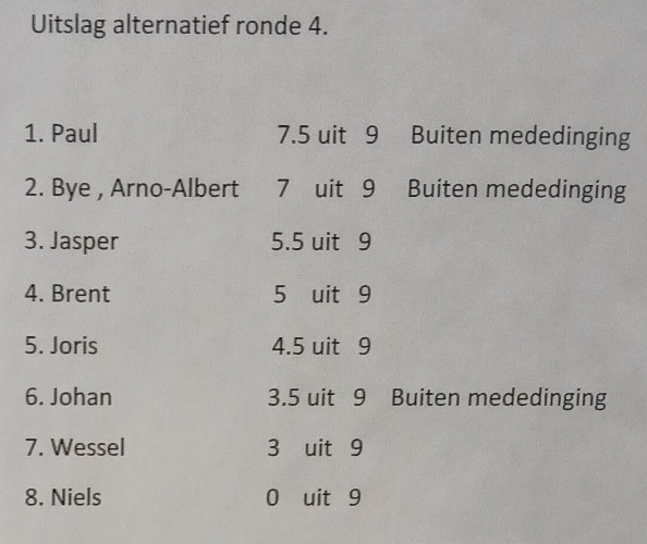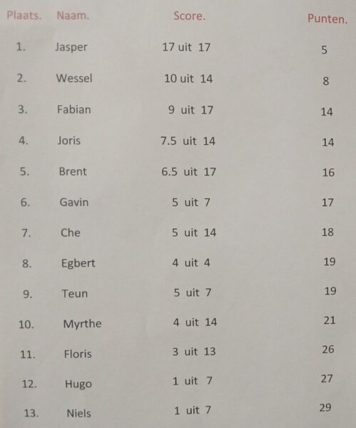 | Nr | Naam | Punten | Wa | Gsp | Gw | Rm | Vl | Perc | WP | SB |