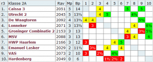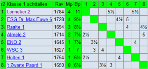 Nr Name Rating Score SB 1 Reinier Luiten (B) 1417 9,5 62,00 2 Lars van Schooten (B) 1424 8,5 56,25 3 Thomas Kanger (C) 1031 8,5 53,25 4 Thierry Pol (A) 1509 8 49,00 5 Martijn Linssen (B) 1018 7,5 46,00 6 Martijn van der Belt (A) 1206 6,5 37,75 7 Yannic Husers (A) 1162 6,5 39,25 8 Levi Nies (D) 1280 6 30,50 9 Thijs Luttikhuis (B) 792 6 23,50 10 Onno Elgersma (E) 727 6 29,00 11 Hein Maathuis (F) 119 6 22,50 12 Mona Al Aboody (C) 477 5,5 20,75 13 Jan-Geert Meulenkolk (D) 155 5,5 26,25 14 Casper Algera (E) 132 5,5 18,00 15 Chantal van Schooten (D) 491 5 11,50 16 Haik Margos (D) 318 5 14,50 17 Joas Tiggelaar (F) 207 5 22,00 18 Veronique Boguslavskii (F) 203 5 12,50 19 Eray Eroglu (D) 0 5 18,00 20 Marvin Klerkx (C) 249 4 10,50 21 Julian Gringhuis (F) 0 3 8,00 22 Krikor Margos (F) 193 2,5 3,50 23 Lennart Gringhuis (E) 0 2 3,00 24 Matthias Schmeisser (F) 0 0 0,00
