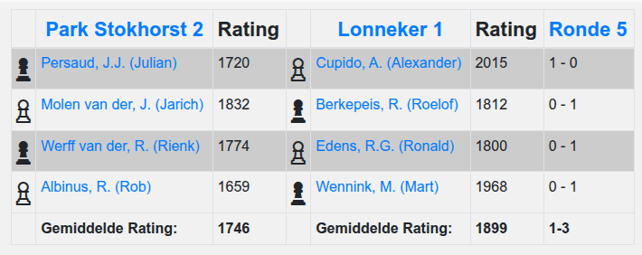 Binnen een minuut hierna was ook Ronald op bord 3 klaar met zijn Wit-partij tegen Rienk, en nog geen minuut later ook Mart met Zwart op bord 4 tegen Rob A. Beiden hadden een fraaie partij opgezet en gewonnen : 0 – 3 was zo beslissend, maar deze avond was nog niet helemaal voorbij.
