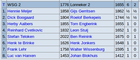 Voor de gelegenheid zat ondergetekende op bord 1. De rest van de opstelling zag er als volgt uit : 2 Roelof, 3 Tom, 4 Leon, 5 Ben, 6 Henk, 7 Walter en 8 Johan.