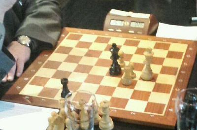 Mijn (Gijs) tegenstander vond dit wel een goed moment om remise aan te bieden. Ik speelde een slechte pot met wit, maar had alles weten te keepen, en met een gezond minnetje op het bord ging ik eerst eens kijken of er nog wat te halen viel vandaag, door de andere borden te inspecteren. Met nog 15 minuten voor 6 zetten had ik immers nog wat tijd om over dit aanbod na te denken. Maar na een kleine observatie en een inschatting van mijn kansen besloot ik deze remise toch maar aan te nemen.