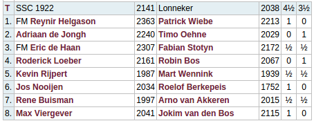 Zunächst gerieten wir auch in Rückstand. Roelof konnte dieses Mal seinem nominell stärkeren Gegner nur wenig Paroli bieten. Ein taktischer Einschlag zwang ihn zur Aufgabe. Schade. [>> Partie]